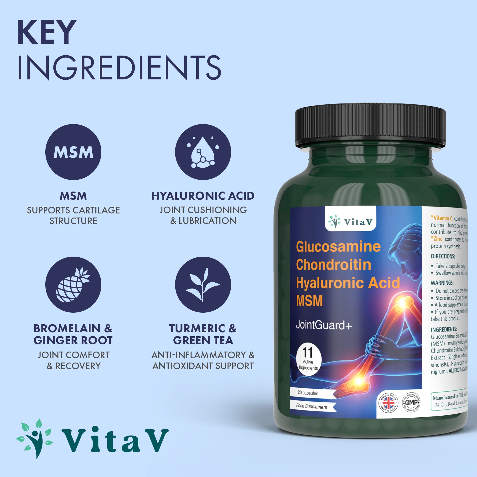 VitaV emphasizes clean, science-backed formulations—free from fillers or unnecessary excipients. JointGuard+ reflects this commitment by offering a transparent, high-quality blend of active ingredients designed for efficacy and integrity.